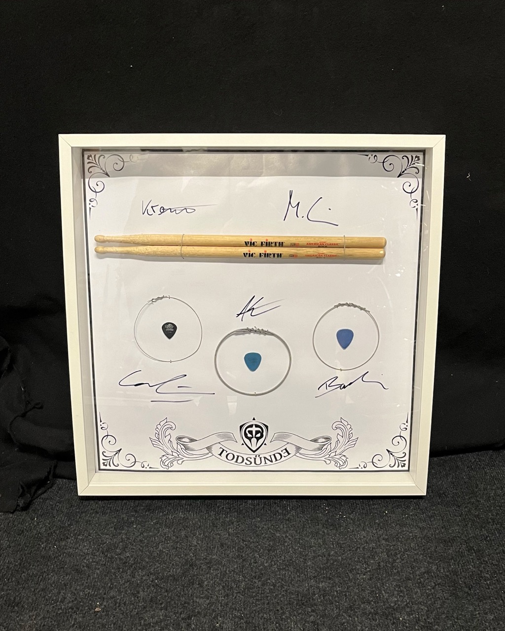 Persönlicher geht's nicht, erhalte eine Gitarrensaite von Colin und Sascha, eine Basssaite von Andy, zwei Drumsticks von Martin, das Ganze in einem Rahmen von allen Bandmitgliedern unterschrieben.